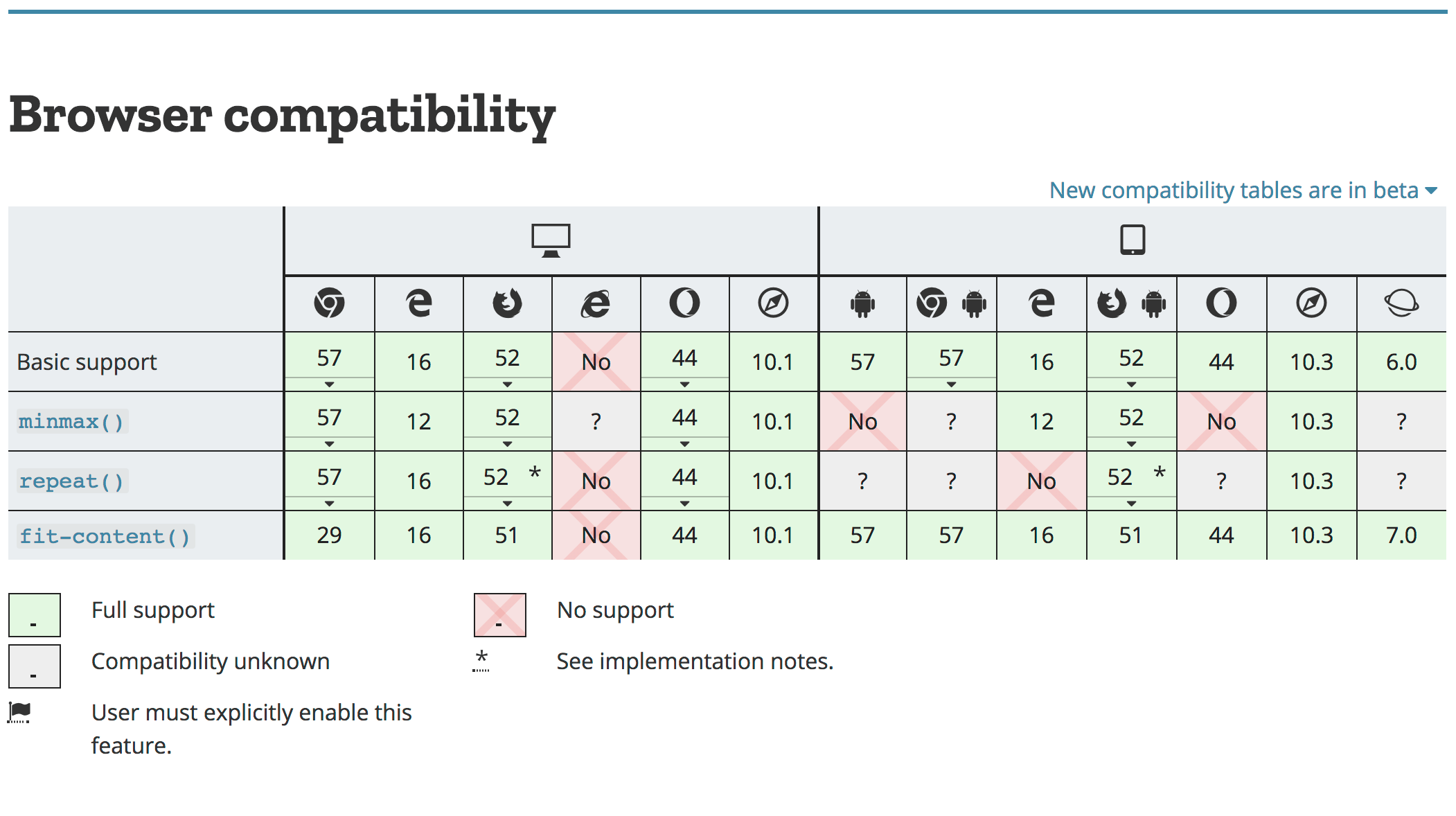 사이트에 들어오는 브라우저를 알면, 해당 대상에 사용하고 싶은 기술을 평가할 수 있고, 그리고 그 기술을 이용할 수 없는 방문객들에게 얼마나 쉽게 대안을 제공할 수 있는지 진단할 수 있습니다. 우리는 CSS 속성을 상세히 설명하는 각 페이지에 대한 브라우저 호환성 정보를 모질라 개발자 네트워크에서 제공함으로써 쉽게 사용할 수 있도록 노력하고 있습니다. 예를 들어, grid-template-columns