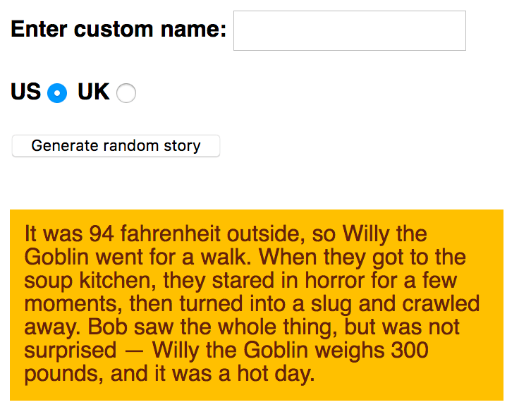 - "Enter custome name" 필드에 값이 입력되어있지 않을 경우 기본 이름을 Bob으로 지정합니다. "랜덤한 이야기 만들기('Generate random story')" 버튼을 클릭 하면 아래 사진에서 "Chris saw the ~.." 로 시작하는 문장이 "Bob saw the ~.."로 표시되게 합니다.