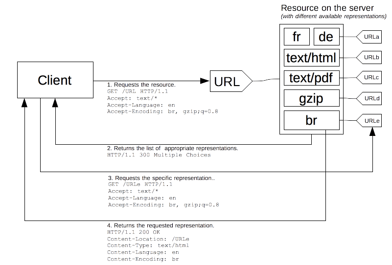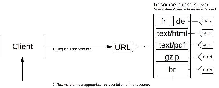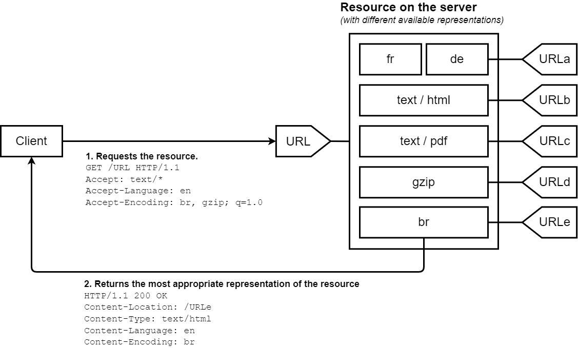 우리는 특정 문서를 리소스라고 부릅니다. 클라이언트가 리소스를 내려받길 원할 경우, 그것의 URL을 사용하여 요청합니다. 서버는 리소스가 제공하는 여러 변형들 중 하나를 선택하기 위해 이런 URL을 사용하며 (각각의 변형을 프레젠테이션이라고 부릅니다) 클라이언트에게 해당 리소스의 특정 프레젠테이션을 반환합니다. 프레젠테이션들에 더해, 전체 리소스들은 특유의 URL을 가집니다. 리소스가 호출됐을 때 특정 프레젠테이션을 선택하는 방법은 콘텐츠 협상에 의해 결정되며 클라이언트와 서버 간의 협상에는 몇 가지 방식이 존재합니다.
