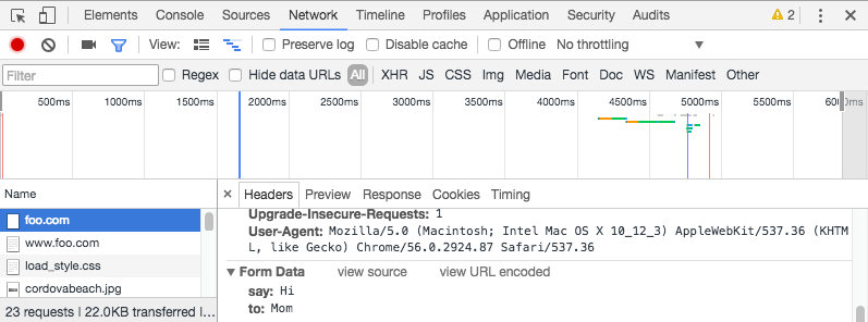 HTTP 请求永远不会显示给用户 (如果您想要看到它们,您需要使用诸如Firefox Network Monitor或Chrome Developer Tools之类的工具)。例如,您的表单数据将显示在 Chrome 网络选项卡中: