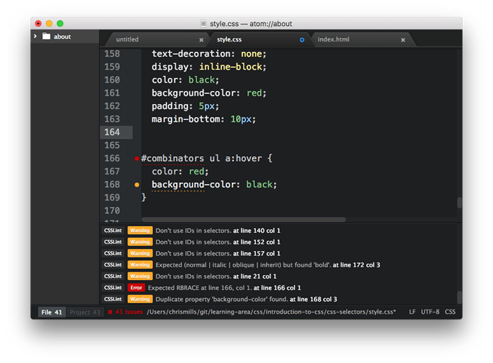 另一个很好的选择就是所谓的 Linter 程序,它不仅可以指出错误,还可以标记关于 CSS 中不良做法的警告,以及其他一些要点。大家可以定制 Linter,以得到更严格或者更宽松的错误/警告报告。