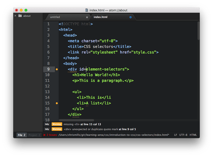 - 软件包完成安装后,尝试加载一个 HTML 文件和一个 CSS 文件:在行号旁边会看到用绿色(警告)和红色(错误)圆圈,突出显示任何存在的问题,底部则提供行号、错误消息,有时有建议的值或者其他修复。