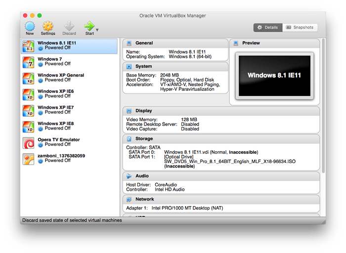 拥有多个虚拟机非常有用,特别是对于 Windows IE / Edge 测试 - 在 Windows 上,您无法并排安装多个版本的默认浏览器,因此您可能需要构建一个虚拟机库来处理根据需要进行不同测试,例如: