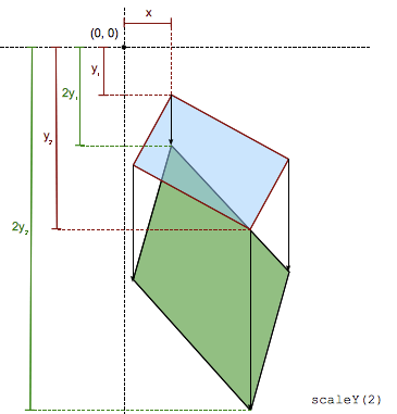 It modifies the ordinate of each element point by a constant factor, except when the scale factor is 1, in which case the function is the identity transform. The scaling is not isotropic, and the angles of the element are not conserved. scaleY(-1) defines an axial symmetry, with a horizontal axis passing through the origin (as specified by the transform-origin property).